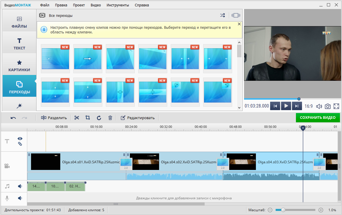 ВидеоМОНТАЖ - это чрезвычайно доступный и удобный видеоредактор, который позволяет легко создавать захватывающие фильмы и затягивающие клипы дома. Всего за 5 шагов вы получите отличное видео с красивыми переходами, названиями, эффектами и фоновой музыкой.