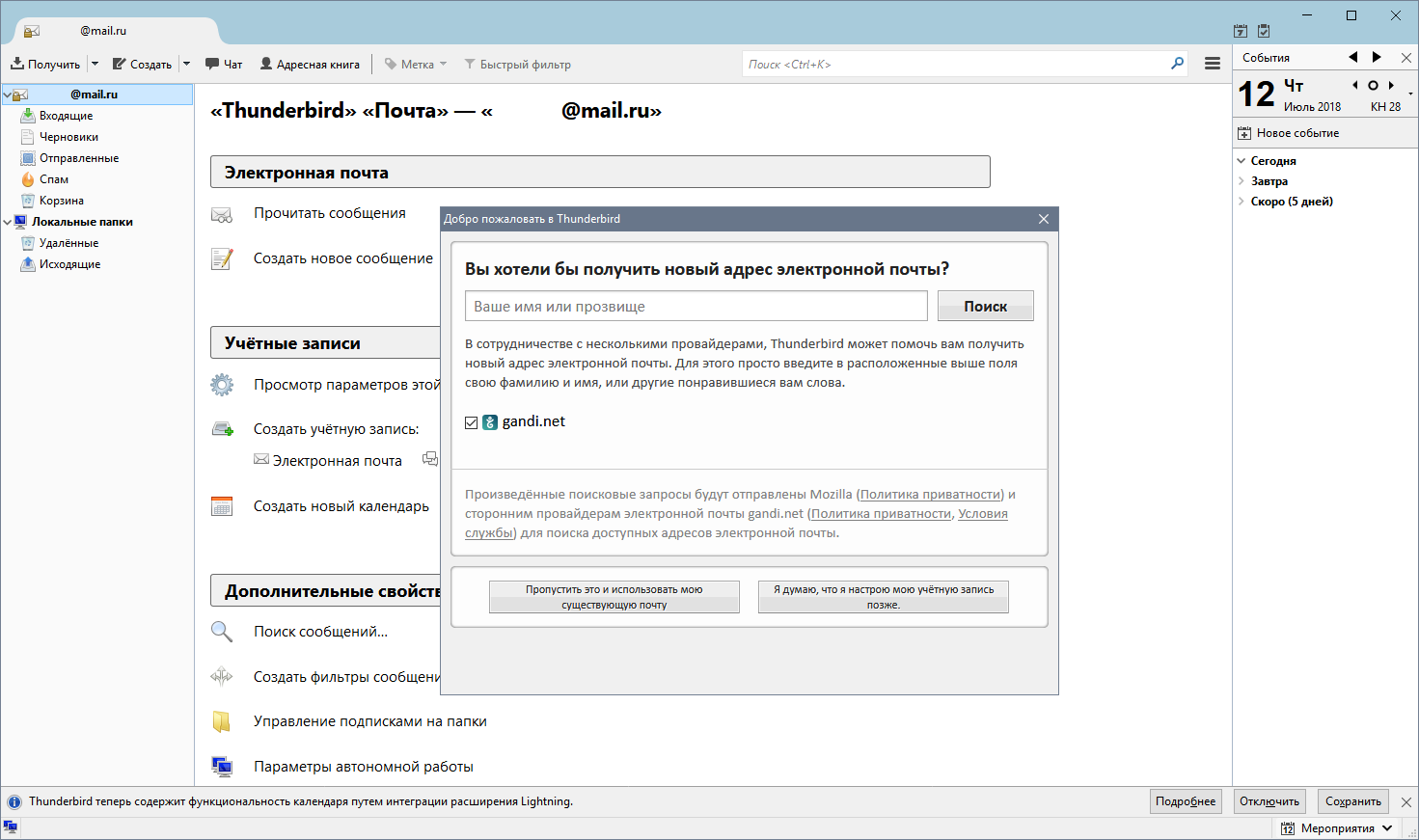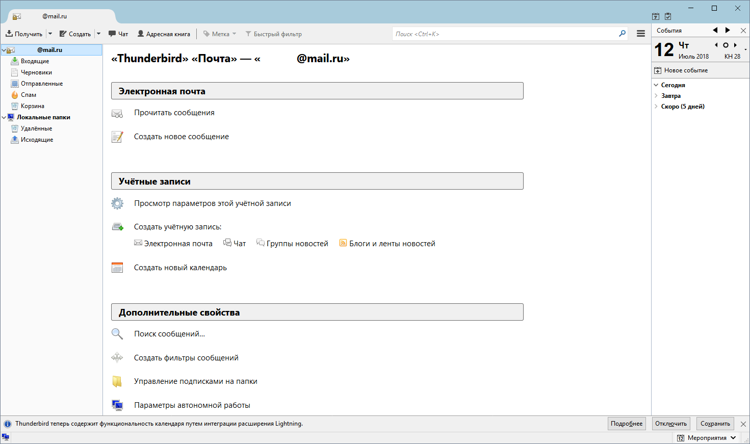 Mozilla Thunderbird - это почтовый клиент с расширенными функциями: фильтрация спама, поддержка IMAP, SSL, фильтры. Также возможно скачивать только заголовки сервера, возможность создавать входящие для нескольких учетных записей одновременно. Он поддерживает возможность получения сообщений с серверов новостей (NNTP) и RSS-каналов.